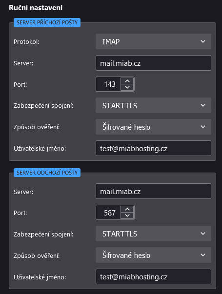 | Server příchozí pošty | mail.miab.cz |